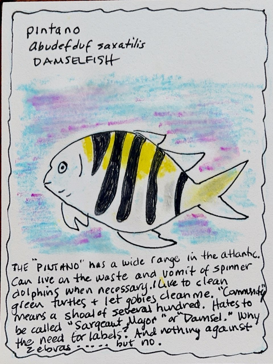 It was wonderful to visit St. Lucia in January. I stayed near the Anse Cochon cove on the south west coast. I spent my days reading, writing, swimming and snorkeling there on the beach. Each morning I sat with my coffee just after sunrise to draw a fish I had seen the day before. The fish made my daily journaling fun, fluid you could, and the morning drawing practice made my time with the fish more rewarding to. I learned the scientific names for the fish, and I tool time notice distinctions between similar species — colors, the shape of a fin, was there black dot? Being with fish, and recording it in this way, was a great way to spend a week, and taught me a few lessons that will continue to be useful when I leave these shores, and go back to other ways of being in the world. Here’s what abudeduf saxatilis had to say! You can look at my zine “Being with Fish” HERE.