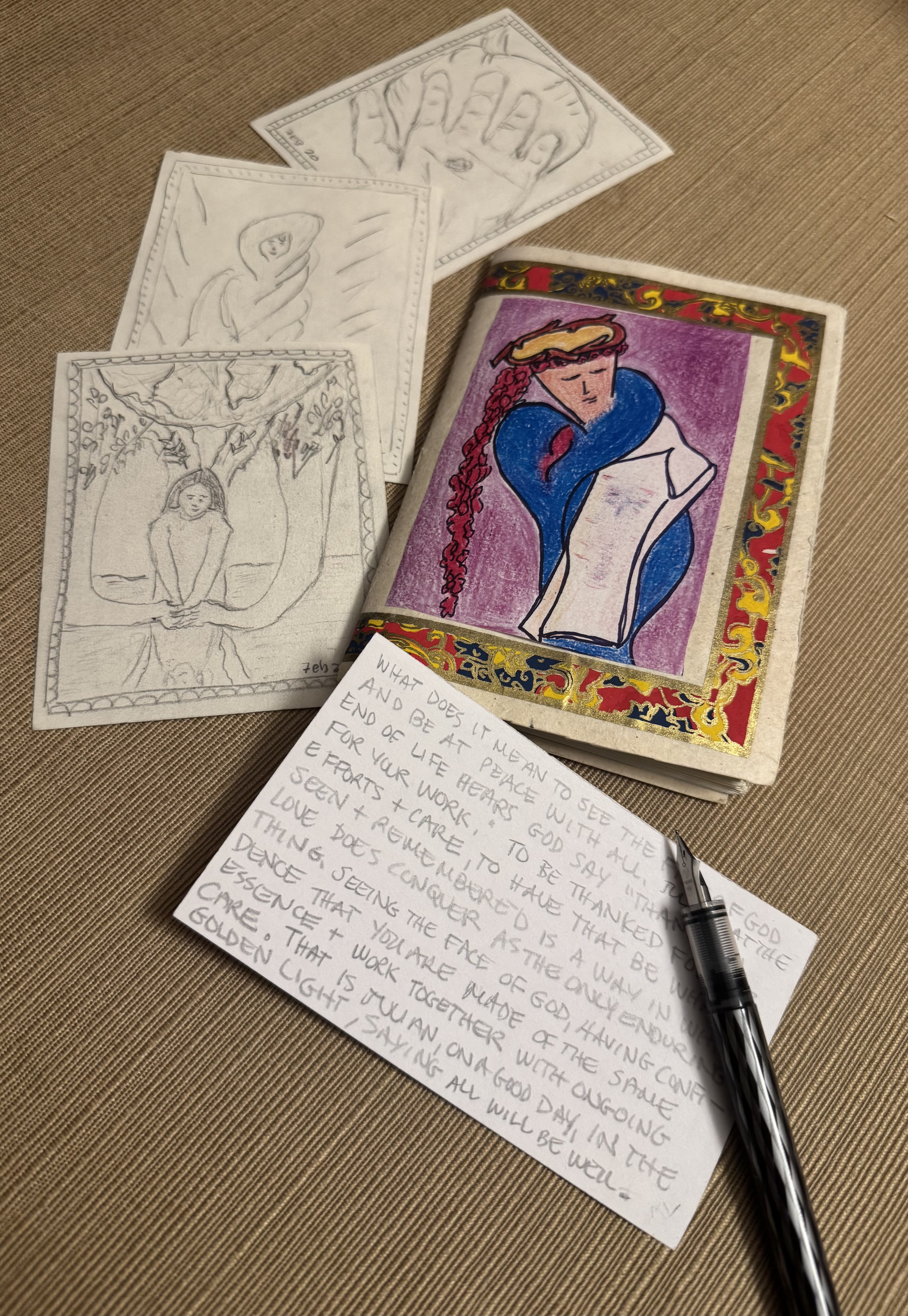 This book of morning reflections on the writings of Julian of Norwich taught me so much. Each day I meditated on a quotation, did a response drawing, and wrote a short reflection. Julian was born in the 14th Century, and lived a cloistered life of prayer and study. From the confines of her cell, she ruminated on the mystical visions of her youth, and provided spiritual guidance to community members and travelers. She wrote in a time of war, plague and social strife and is believed to be the first woman to be published in the English language. I hope that readers here, whether familiar with the writings of Julian of Norwich, or encountering the selected quotes for the first time, will see what I have shared as an invitation to their own creative contemplation and mindful, hopeful witness.