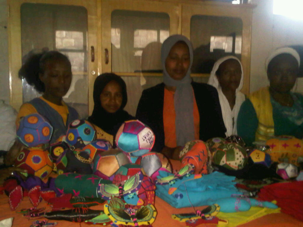 We met the group in the local school where they have a workroom. There were about 10 women, along with 4-5 children, clustered around their sewing machines (the non-electric foot pump kind!), some doing handsewing while they waited. We shared awkward translated introductions, but generally smiles prevailed, as we told them about ourselves what we were interested in, and asked them ithey would like to sell some of their products in Wisconsin! They told us a bit about their lives, both before and after the program, and then we made our way to the table where their goods were displayed. Brightly colored napkins, embroidered pillow covers, pieced balls with the amharic alphabet on them, and small stuffed animals — alligators, hippos, an elephant. They also earn money by making uniforms for local schools.